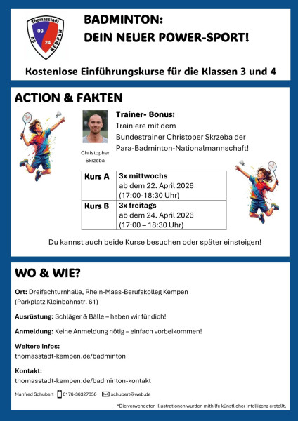 Am 25. Januar 2026 war es endlich soweit: Der SV Thomasstadt 09/24 e.V. Kempen durfte in der Sporthalle des Rhein-Maas-Berufskollegs einen ganz besonderen Badminton-Tag ausrichten. Gemeinsam mit dem Deutschen Badminton-Verband e.V. (DBV) luden wir zum „Ersten Kempener Einzel Cup 2026“ ein – einem Schüler-Einzelturnier (U15) –, das in Kombination mit dem BadIN! – Badminton INKLUSIV! – Spieltag... [weiterlesen]